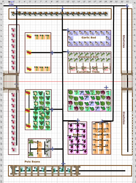 The illustration is of our Upper Garden (still in the planning stages). A raised bed garden where we experiment with Square Foot Gardening, as well as locate our garlic and asparagus beds. This year we used the Garden Planer to plan the irrigation system. Once everything was located, the Garden Planner produced a materials list detailing what was needed to complete the irrigation system. This materials list was very helpful to review our current inventory of irrigation parts and enabled us to order new.