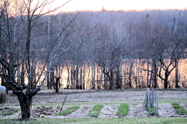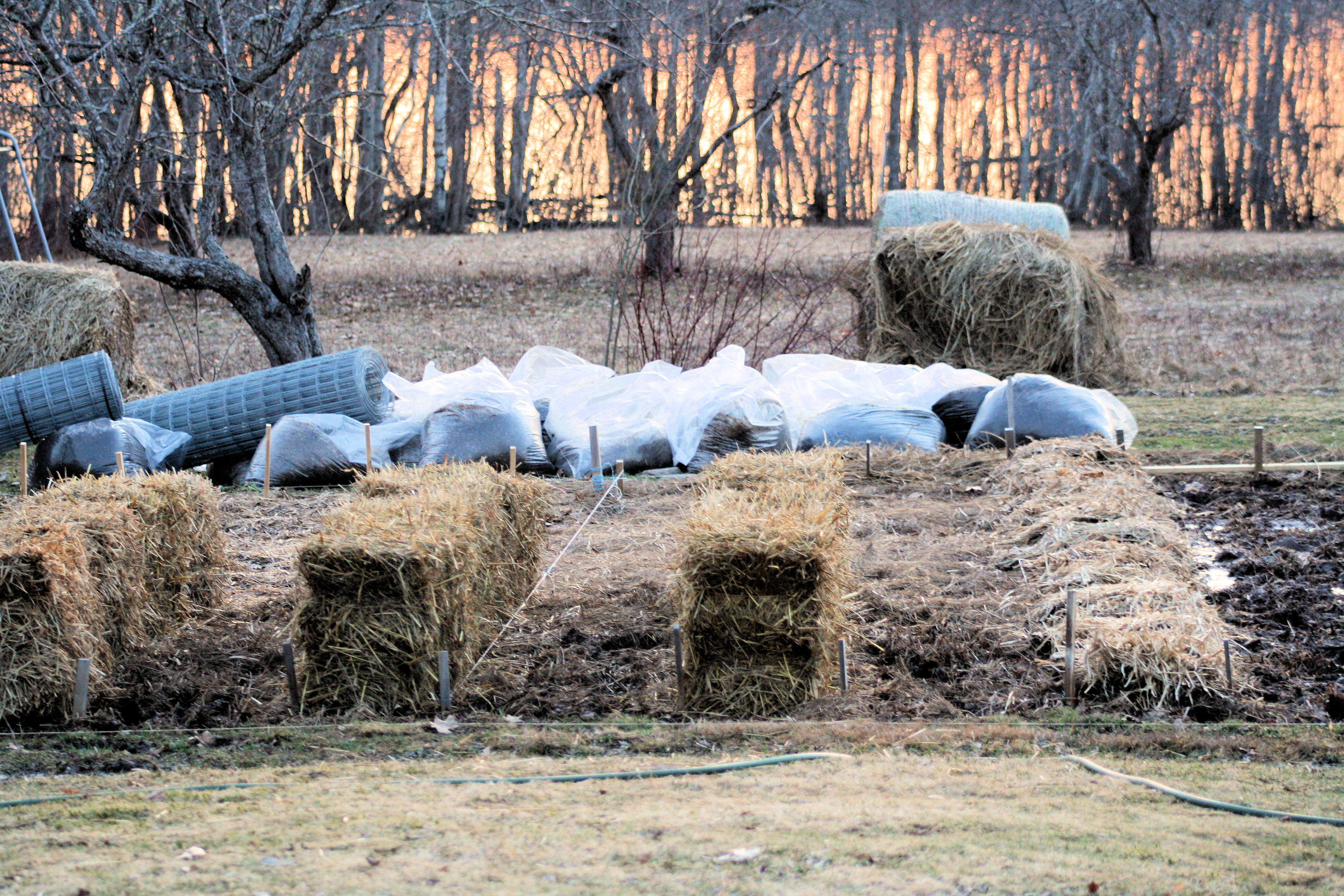 The quality of the soil determines the success of your garden. We have been working on our soil for several years by continually adding organic material. The lower garden has presented some challenges as it is situated at the bottom of an old orchard and the water drains to the garden. The solution chosen, raised rows, and last year half of the garden was a success. This year the other half is being prepared for the season. This half is very wet and drains poorly. Before we install drainage, we will be experimenting with straw bales and more raised rows to raise the plants out of the wet soil. As the bales compost down we are hoping to create the raised rows that will solve our wetness problems.